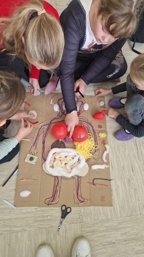 V petek, 7. novembra 2025, so učenci 4. a in 4. b razreda medpredmetno povezovali cilje naravoslovja in tehnike (NIT) ter likovne umetnosti (LUM) ter izdelali zanimive modele človeških prebavil in dihal. Poleg tega, da so usvojeno snov utrdili, so se ob delu tudi medsebojno povezovali, sodelovali in se zabavali. Učenci so predstavili zgradbo organov s pomočjo modela, razvijali spretnosti sodelovanja in uporabe znanja pri ustvarjalnem delu.