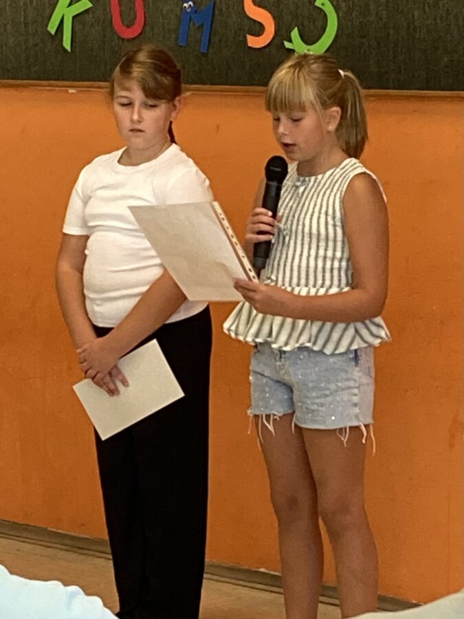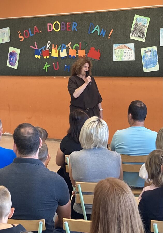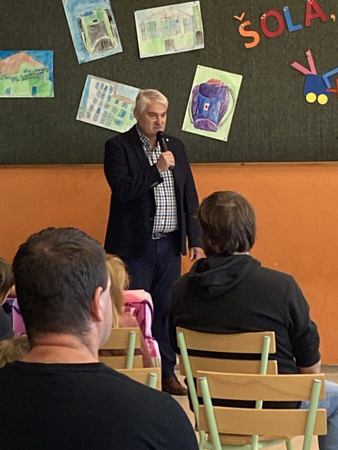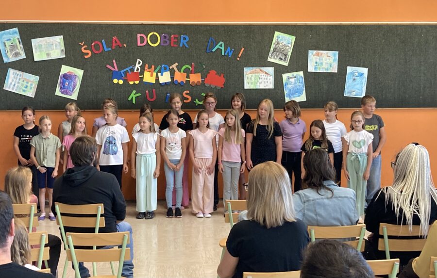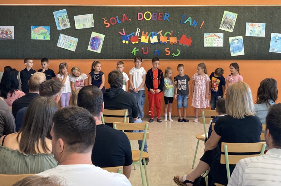S pozdravom »Dober dan, šola! smo na prvi šolski dan prijazno sprejeli in pozdravili naše prvošolce in njihove starše. Kulturni program, na katerem so se predstavili otroški pevski zbor, učenci z deklamacijami in inštrumenti, je še poudaril slovesnost dogodka ob vstopu v šolo. Kljub razburjenosti, radovednosti, strahu in pričakovanju so prvošolci zvedavih pogledov spremljali dogajanje in poslušali tako nagovor ravnateljice, ki jih je pozdravila na naši šoli, kot tudi g. župana, ki jim je enako namenil spodbudne besede na njihovi novi šolski poti.